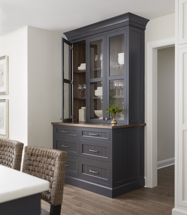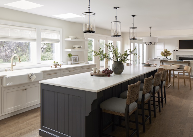 With small children there’s hardly ever enough space to prep and store anything, especially in the kitchen. Moreover, teens and adults love to gather at the island but that’s not an option for tip-over-prone toddlers. So we made sure our homeowners had all the space they need for the accoutrements of a burgeoning household. We gave them island seating and a breakfast table. With adjacent soft seating and a fireplace, this is truly a family kitchen.