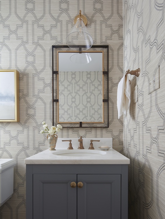 Throughout the house, a nod to texture, subtly applied, speaks volumes. Such is the case in this cozy main level powder room outfitted with Thibaut wallcovering. The blue vanity complements the darker blue found in the kitchen and even references some of the shades in the family room. Continuity is just the best!