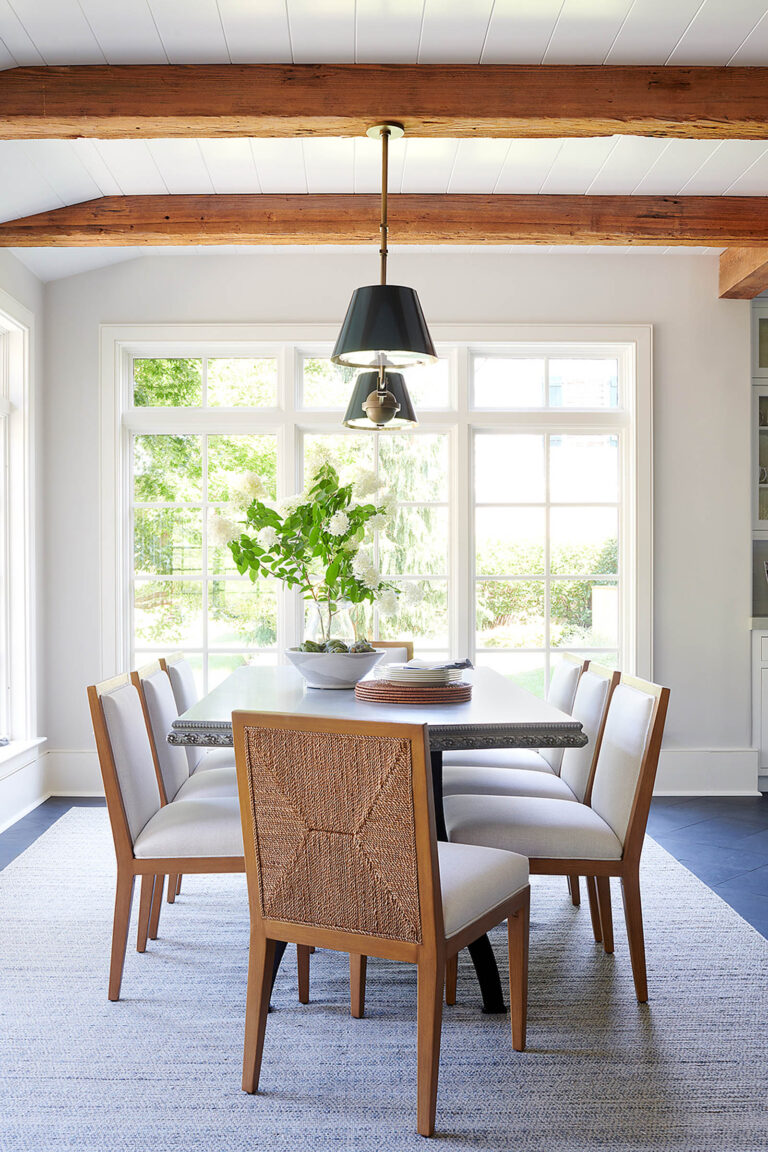 Deciding to take up full-time residence in their weekend home, our clients’ priority was to transform the outdated spaces to match their lifestyle and aesthetics. The first challenge was to open up the kitchen to the great room, creating a family-centric living area on the first floor. With a growing family, the two farmhouse sinks and dishwashers provide ample space for cooking, baking prep, and clean-up. A hand-cut glass backsplash tile in custom colors creates a statement focal point and was inspired by the blue-veined quartzite counters. The sunlit morning room opens to the kitchen for easy family dining. The reconfigured butler’s pantry features a one-of-a-kind reclaimed decorative panel from India and glass-fronted cabinets that add layers of interest. Along the back wall, floor to ceiling storage is easily accessible with a library ladder. The mudroom and laundry room were combined into a single functional yet sophisticated space. The mudroom has a combination of open and closed cabinetry and a center bench seat. We tailored the laundry area with generous cabinets for maximum storage and added a patterned cement tile backsplash to tie the countertops and floor together. Finally, the family’s beloved dog needed her own space, so we designed a custom dog crate fit for a queen with storage to hold all her important things.